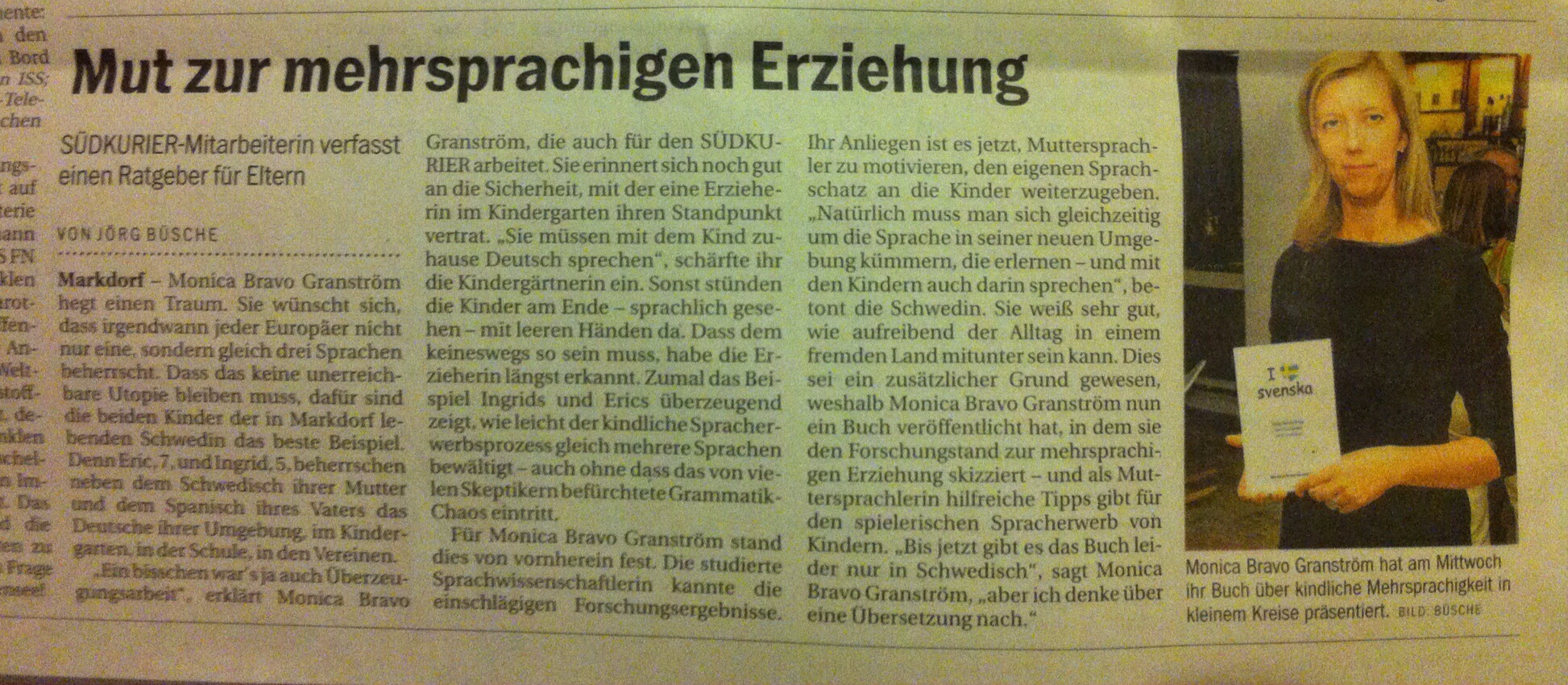 Recension BTJ (bibliotekens upphandlare, www.btj.se). Utdrag ur recensionen: Om man som svensk förälder bosatt utomlands vill hålla sina barns svenska vid liv och dessutom uppfostra dem till aktivt två- eller flerspråkiga, hur ska man då göra? Denna bok föreslår några svar och är utformad som en praktisk handbok för föräldrar utan kunskaper i språkvetenskap. Boken är indelad i två delar. Den första ägnas åt en vetenskaplig översikt av begreppet tvåspråkighet och lyckas i huvudsak balansera det vetenskapliga utan att tappa fokuset på det praktiska. … Den andra delen utgörs av praktiska tips och råd hur man går till väga. Monica Bravo Granström, översättare, språkvetare och mamma till trespråkiga barn, är väl lämpad för uppgiften och fyller en lucka i den svenskspråkiga litteraturen. Sammantaget en mycket användbar bok som innehåller tips om relevanta länkar, ordlista och litteraturlista. (Lektör Dick Nilsson, häfteepos 14104065)